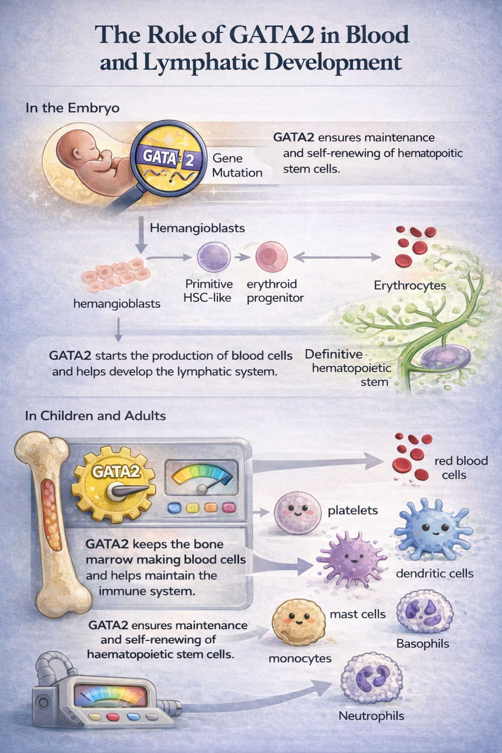 GATA2 deficiency is a rare genetic condition that affects the blood and immune system. The GATA2 gene acts like an important control switch that helps the body make healthy blood cells. It is active from early development before birth and continues to play an important role throughout life.